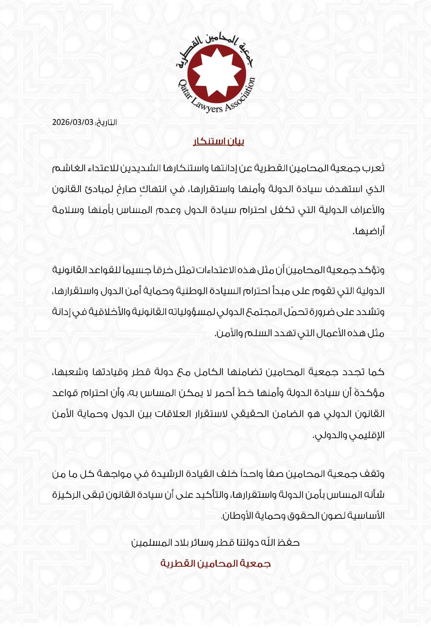 تعرب جمعية المحامين القطرية عن إدانتها واستنكارها الشديدين للاعتداء الغاشم الذي استهدف سيادة الدولة وأمنها واستقرارها، في انتهاك صارخ لمبادئ القانون والأعراف الدولية التي تكفل احترام سيادة الدول وعدم المساس بأمنها وسلامة أراضيها.
