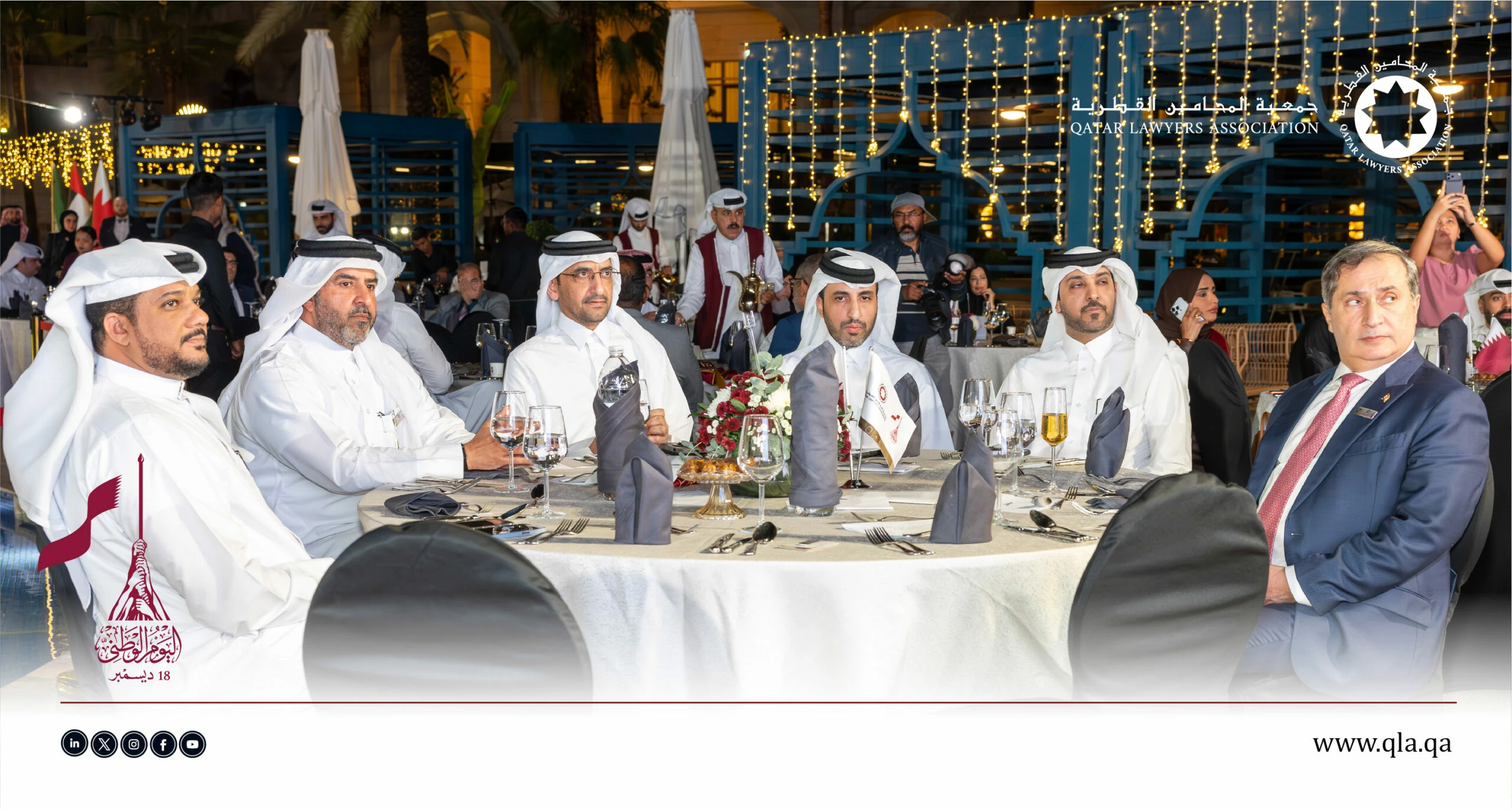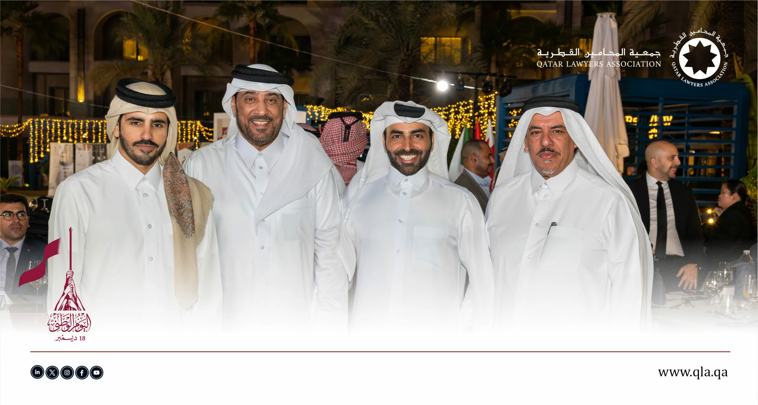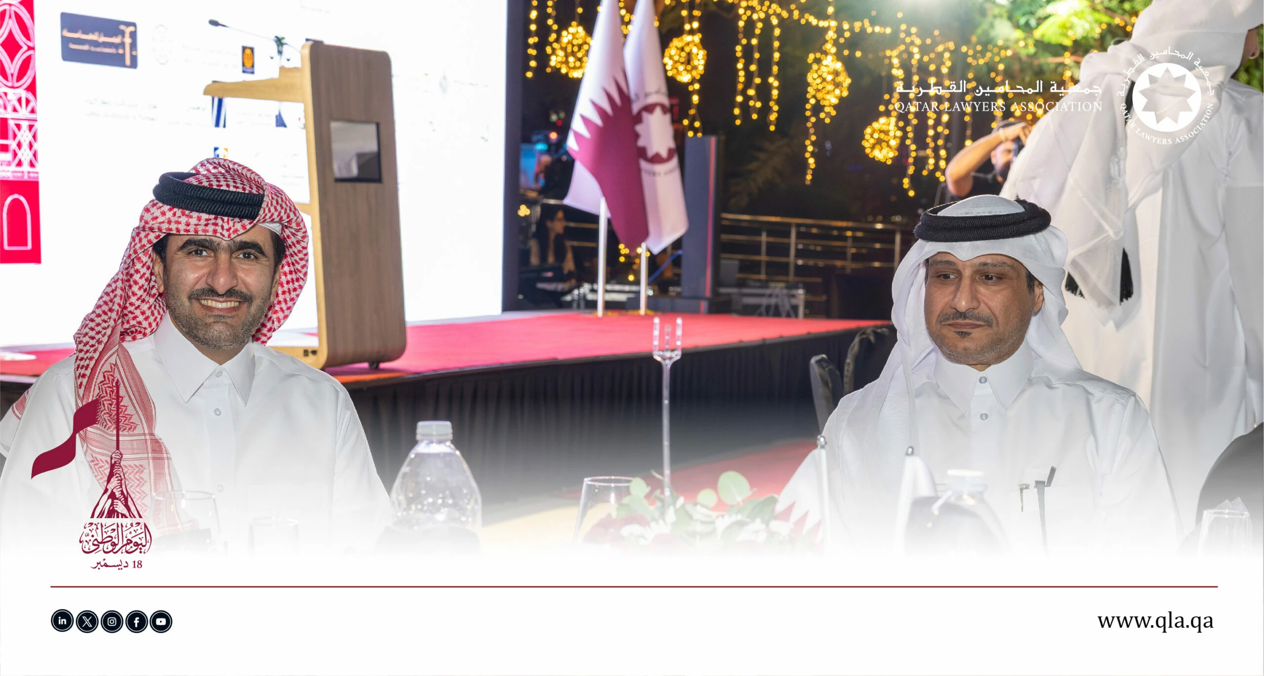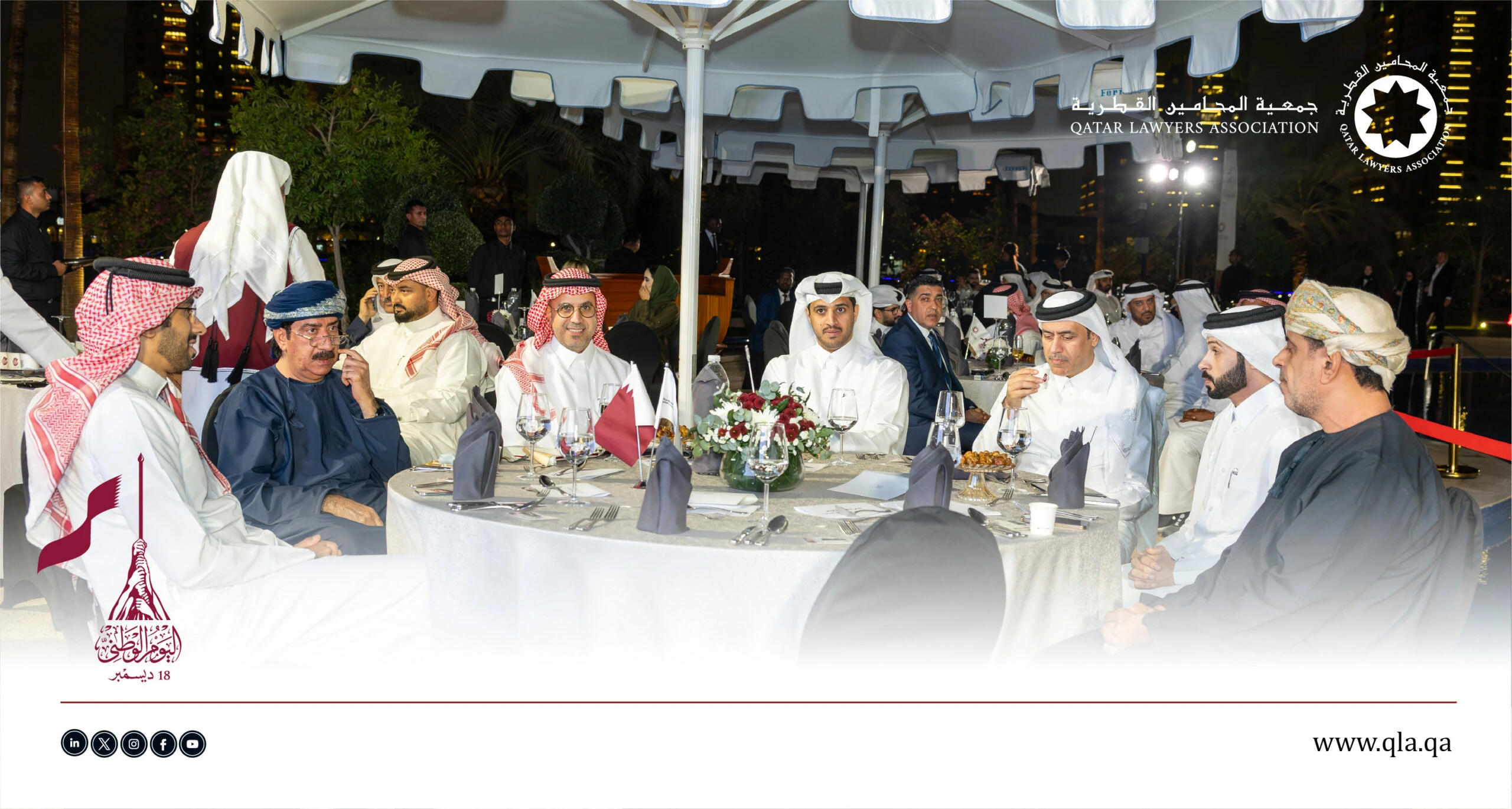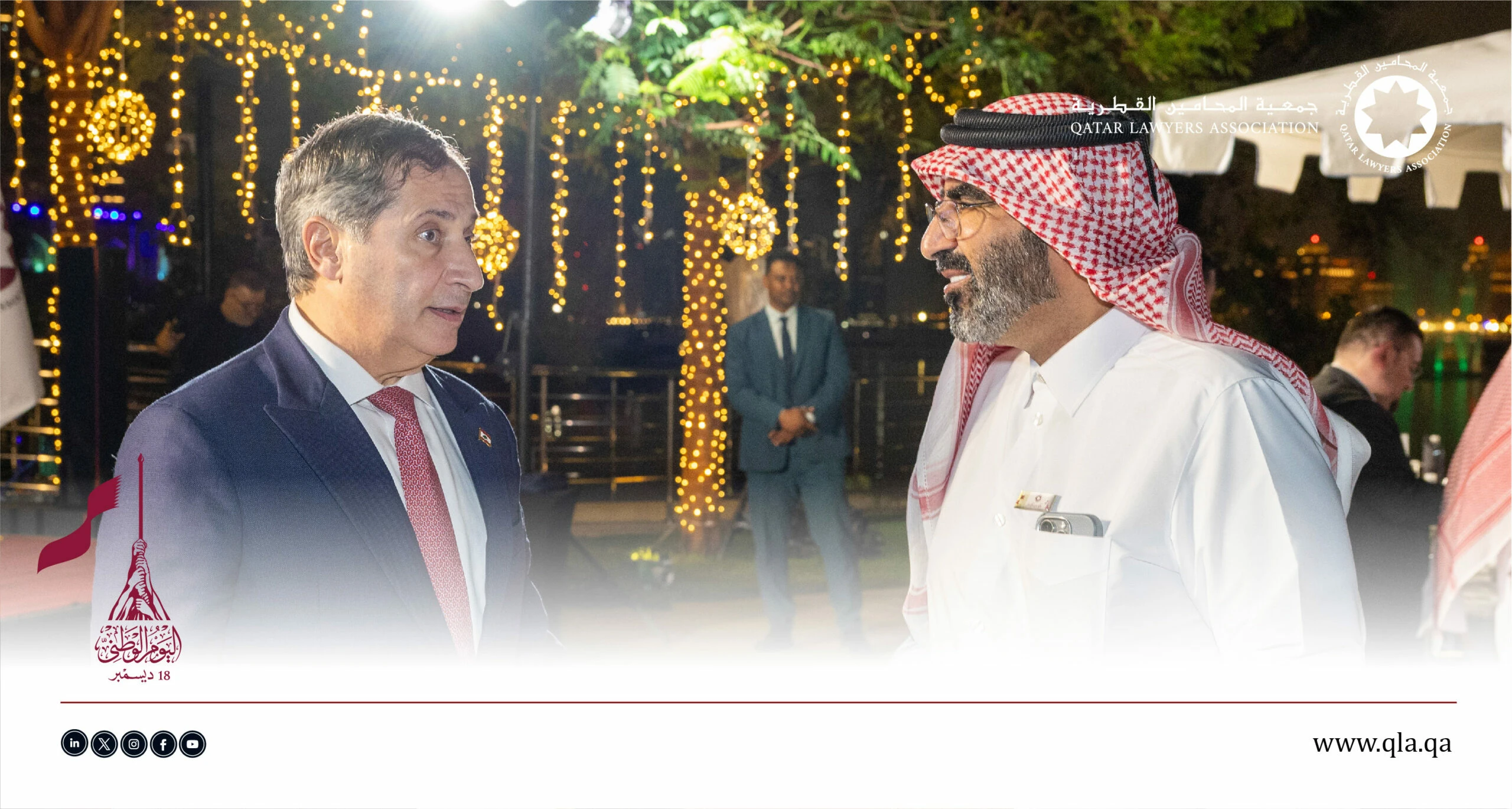 تحت رعاية وحضور سعادة السيد إبراهيم بن علي المهندي، وزير العدل ووزير الدولة لشؤون مجلس الوزراء، أقامت جمعية المحامين القطرية أمسية حفل اليوم الوطني القطري يوم الثلاثاء الموافق 16 ديسمبر 2025 في تمام الساعة 06:00 مساءً، وذلك في فندق سانت ريجس مرسى عربية – اللؤلؤة.