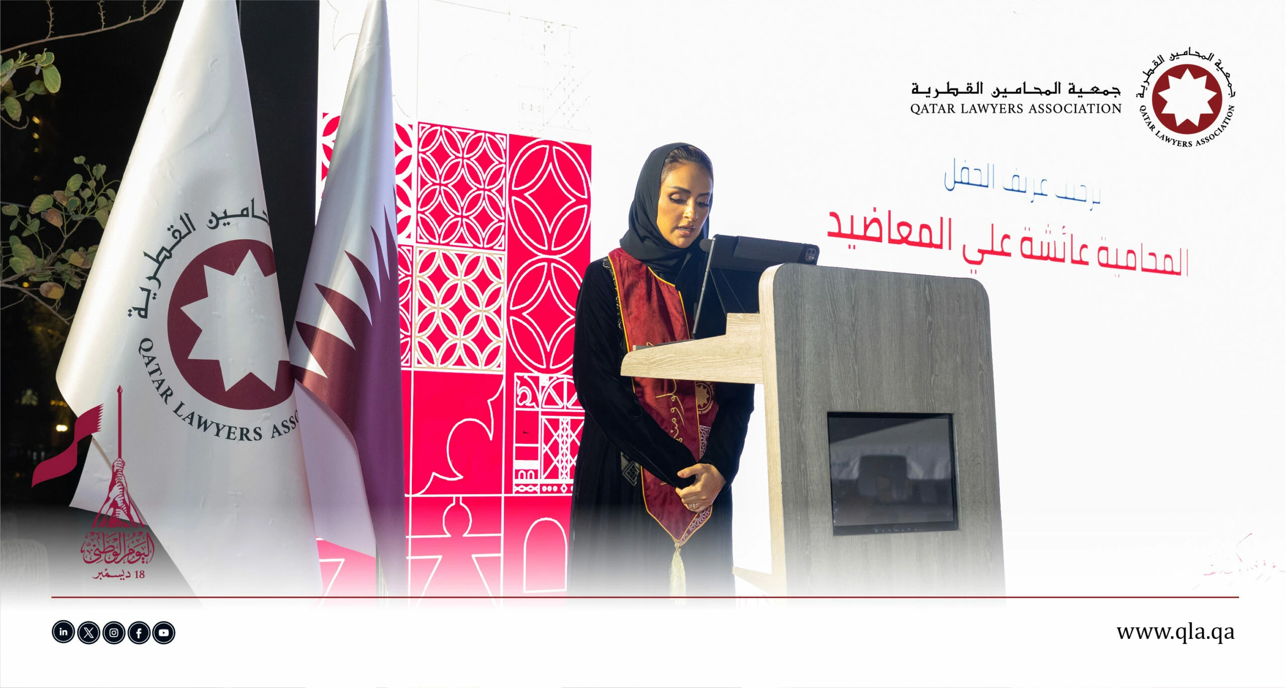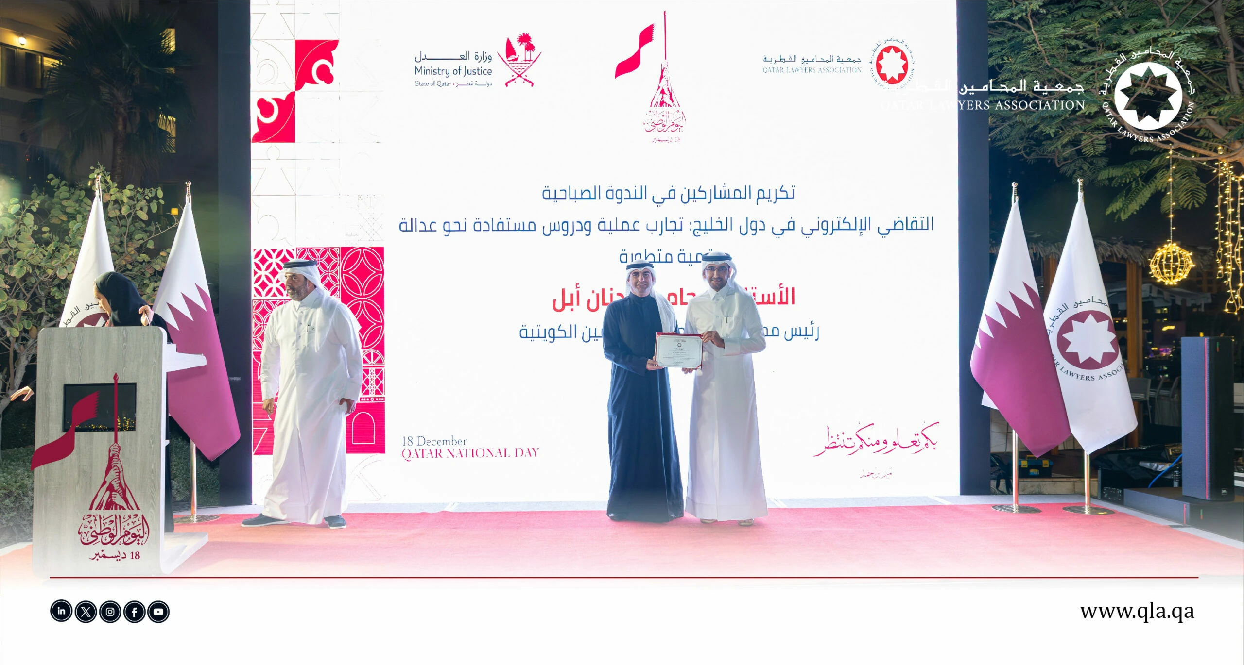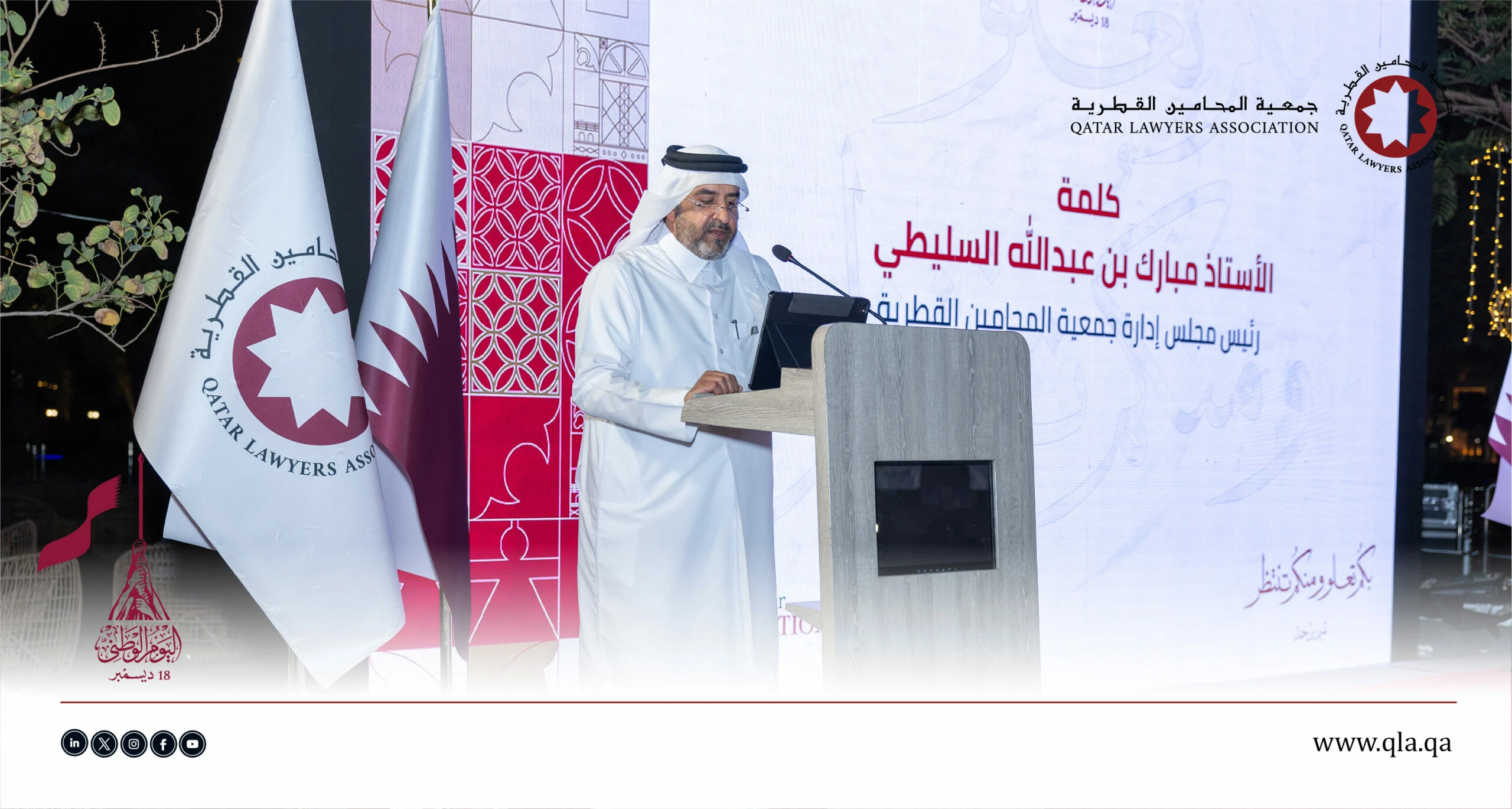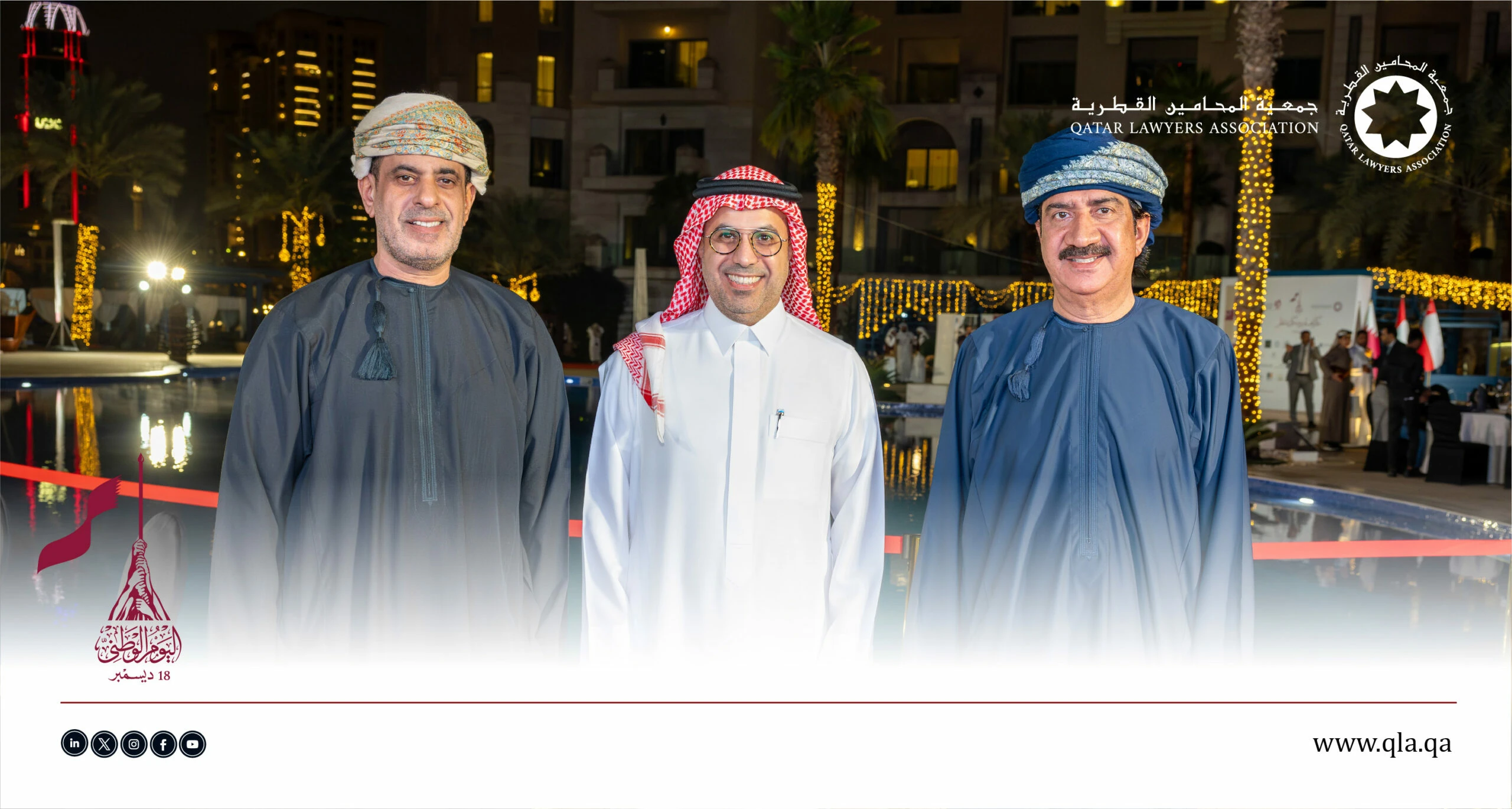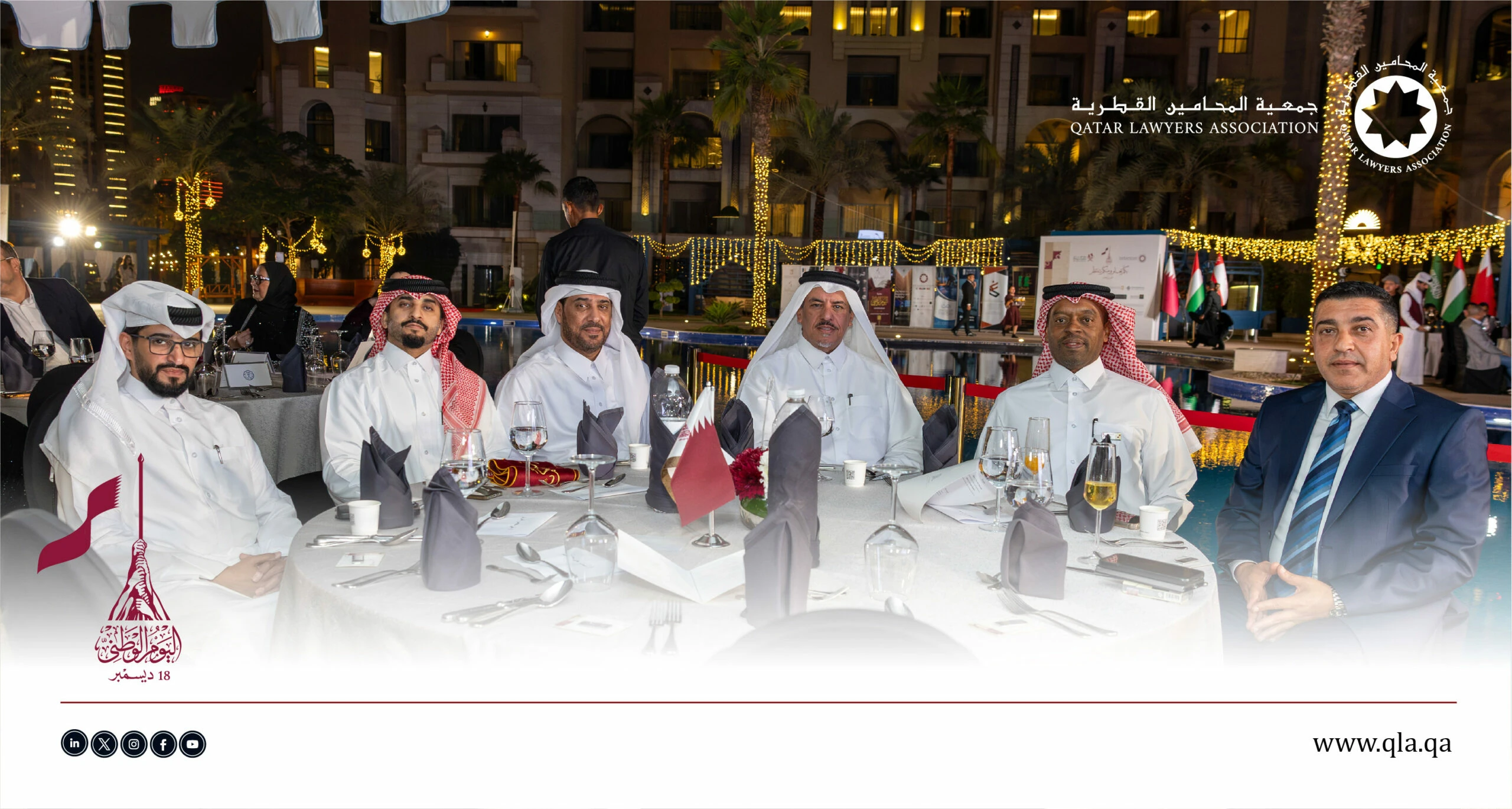 تحت رعاية وحضور سعادة السيد إبراهيم بن علي المهندي، وزير العدل ووزير الدولة لشؤون مجلس الوزراء، أقامت جمعية المحامين القطرية أمسية حفل اليوم الوطني القطري يوم الثلاثاء الموافق 16 ديسمبر 2025 في تمام الساعة 06:00 مساءً، وذلك في فندق سانت ريجس مرسى عربية – اللؤلؤة.