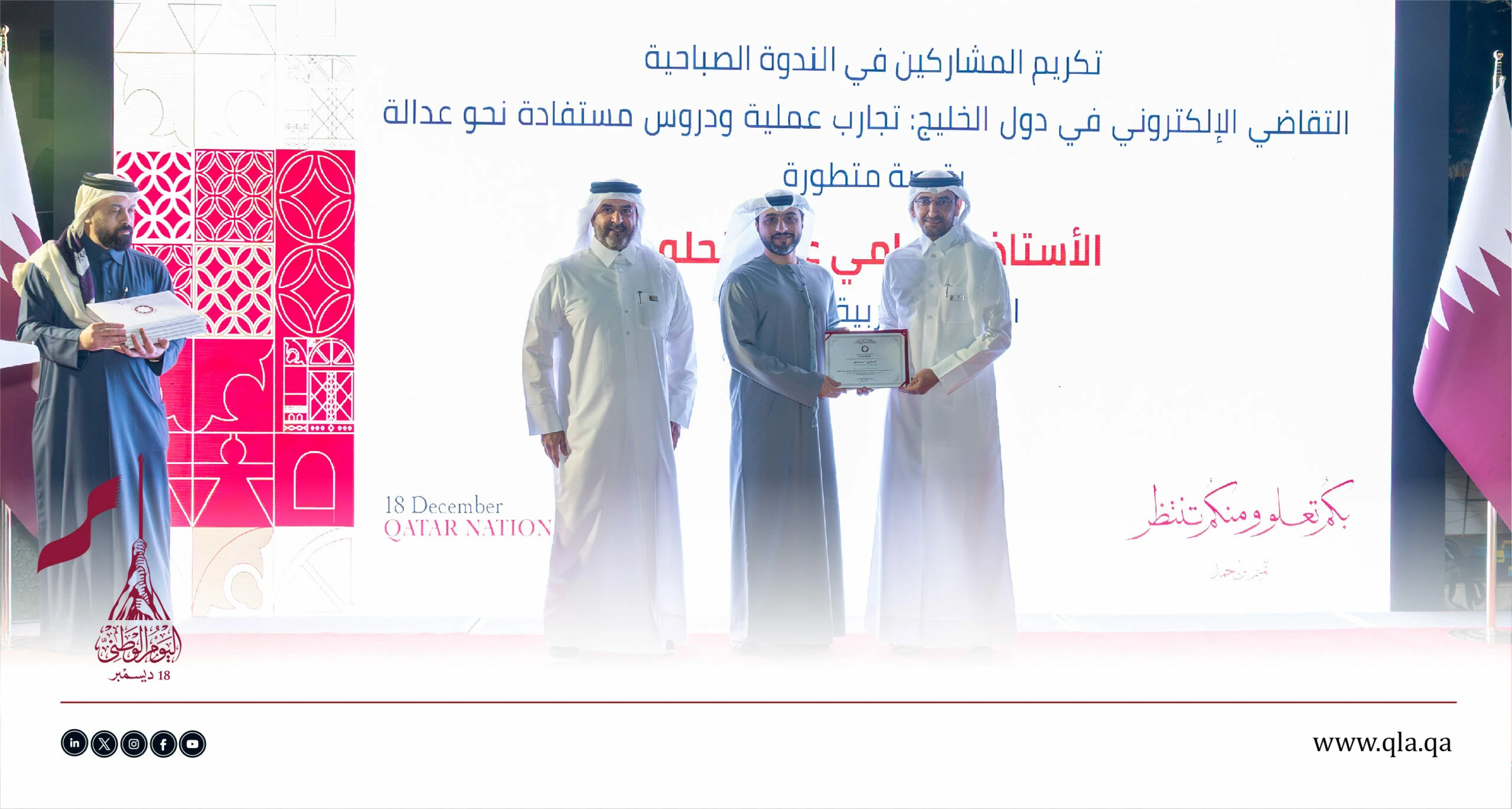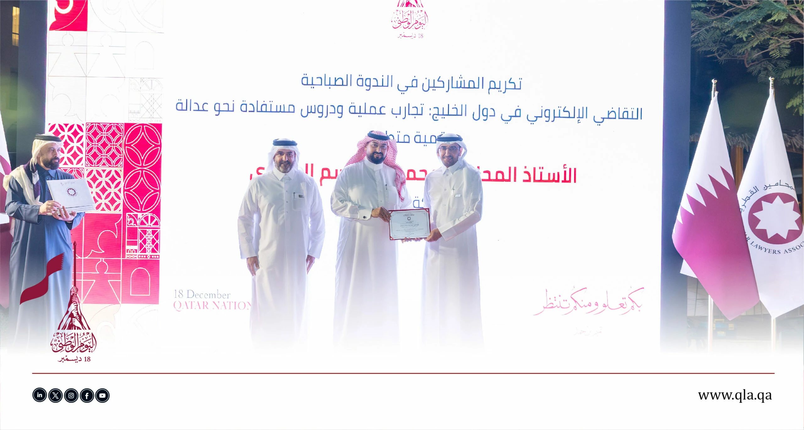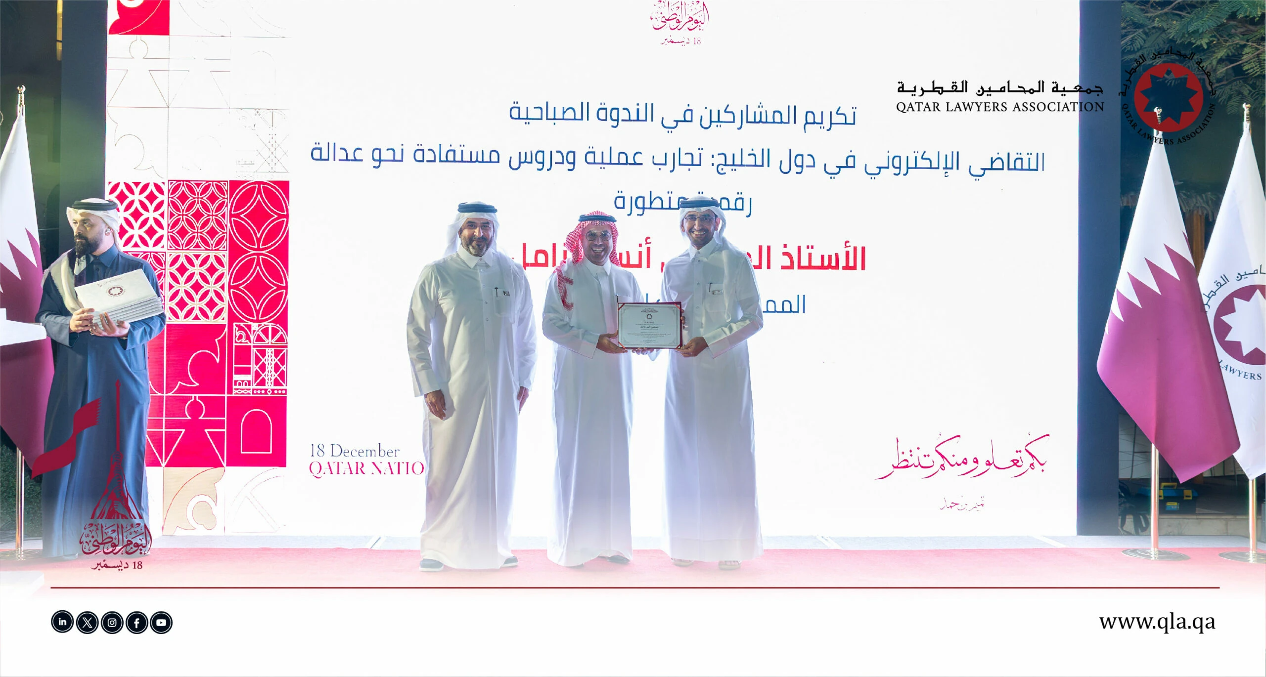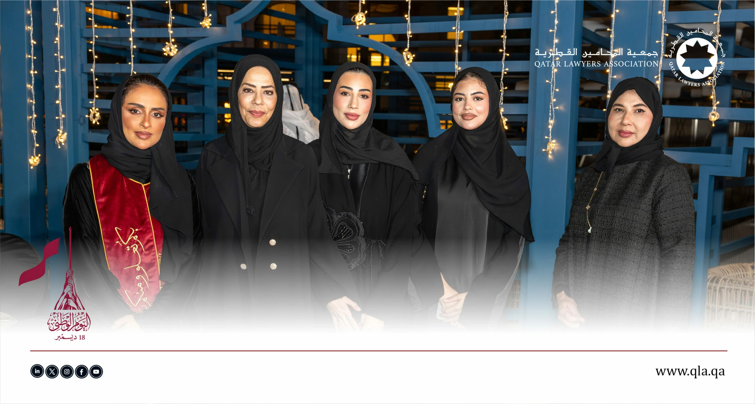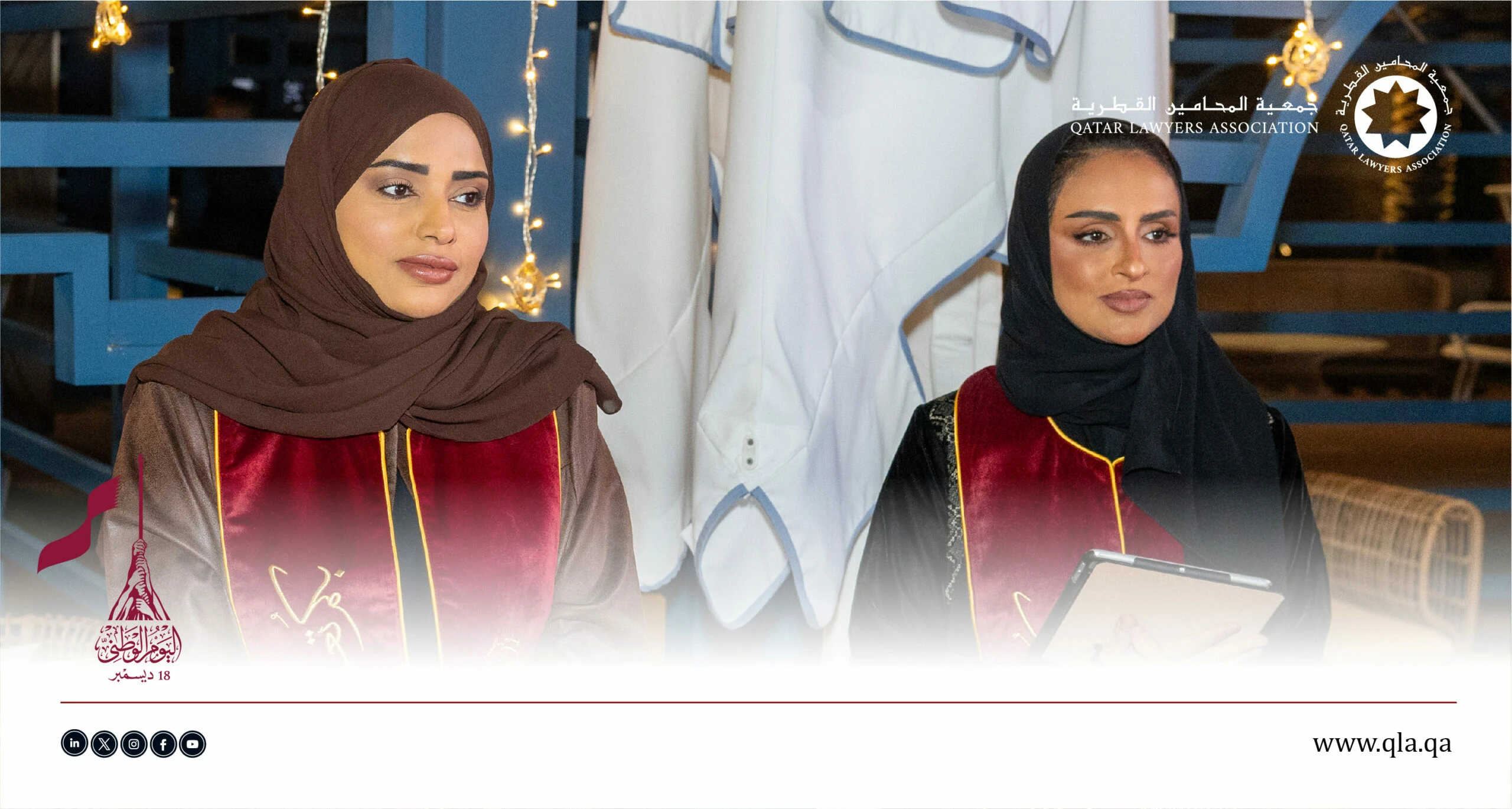 تحت رعاية وحضور سعادة السيد إبراهيم بن علي المهندي، وزير العدل ووزير الدولة لشؤون مجلس الوزراء، أقامت جمعية المحامين القطرية أمسية حفل اليوم الوطني القطري يوم الثلاثاء الموافق 16 ديسمبر 2025 في تمام الساعة 06:00 مساءً، وذلك في فندق سانت ريجس مرسى عربية – اللؤلؤة.
